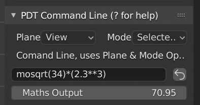 Here the command mosqrt(34)*(2.3**3) was used, meaning; Maths, Output, Square Root of 34 times 2.3 cubed. This value can be copied by floating your mouse over the field and keying CTRL+C, it can then be pasted anywhere.