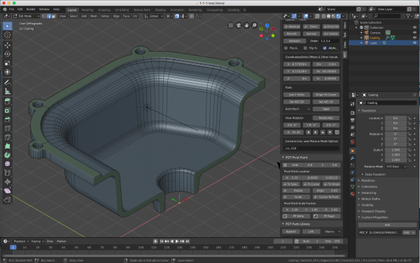 Most of the accuracy of this model would be either impossible, or so very complicated, to achieve with Blender on its own. With PDT and Offset Edges, it was quick and easy to achieve this kind of topology, suitable for mechanical models, at a very high level of precision (constrained only by the storage of coordinates in Blender). You can also see the Pivot Point of this model, stored in its Custom Property.