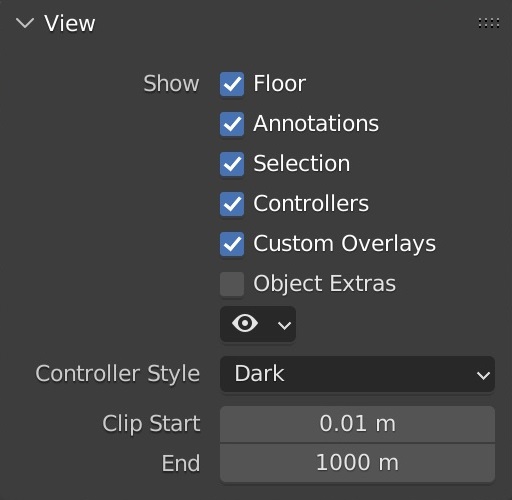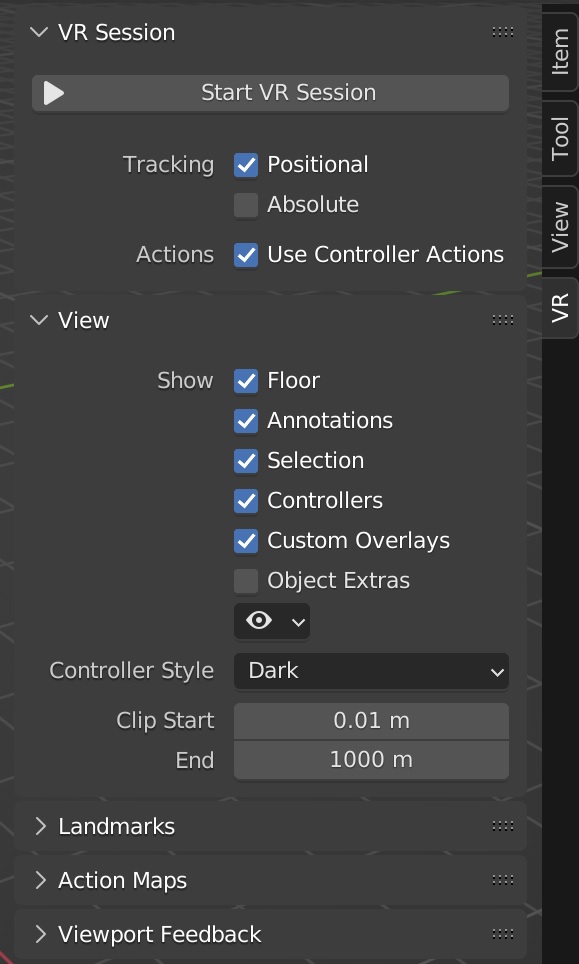 Clipping values of the VR view, as in the 3D Viewport.