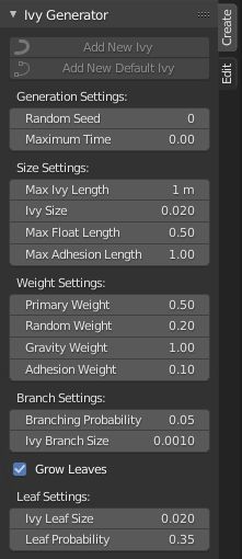 The Add Default Ivy operator will use the default parameters during creation. This will generate your initial Ivy Curve and Leaves. From here you can access the Ivy menu in the Sidebar. I suggest to make small changes and then press Update Ivy in the 3D Viewport operator.
