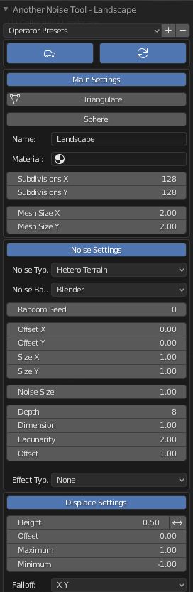 After creating your landscape mesh there are three main areas in the Adjust Last Operation panel to design your mesh.