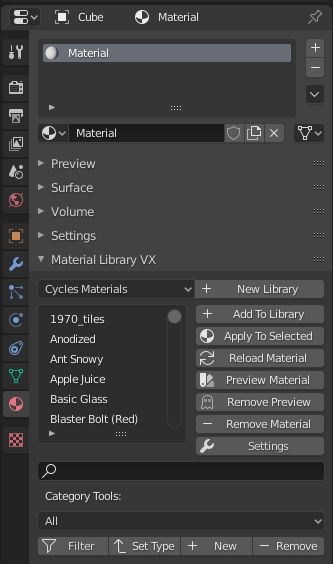 Materials Library VX is a Blender add-on that will create a material library. You can save, load and categorize materials that can be shared across all your projects. This version uses a blend-file as database so all external render engines, all node materials and textures are supported. It also makes use of Blender compression.