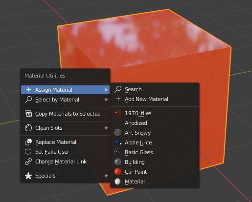 Menu of material tools (assign, select…) in the 3D Viewport.