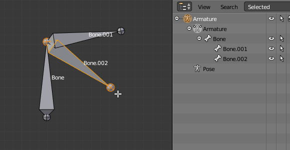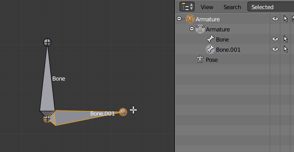 When you press E, for each selected tip (either explicitly or implicitly), a new bone is created. This bone will be the child of “its” tip owner, and connected to it. As usual, once extrusion is done, only the new bones’ tips are selected, and in select mode, so you can place them to your liking. See Fig. Extrusion example..
