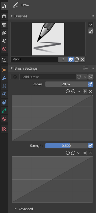 In the Tool Settings select the brush, material and color type to use with the tool. The Draw tool uses Draw Brush types. See Brush Settings for more information.