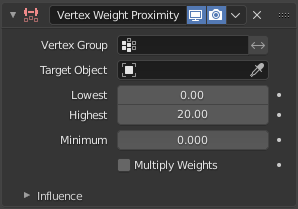 This modifier sets the weights of the given vertex group, based on the distance between the object (or its vertices), and another target object (or its geometry).