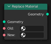 The Replace Material node swaps one material with another. Replacing a material with this node is more efficient than creating a selection of all faces with the old material with the Material Selection Node and then using the Set Material Node.