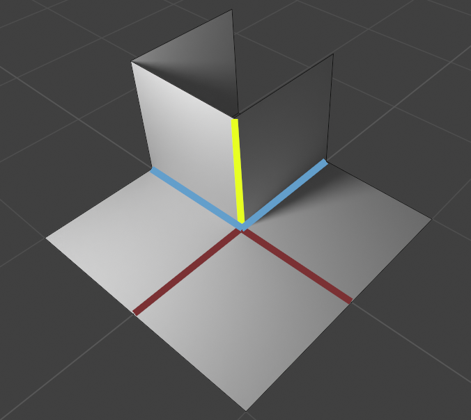 Attribute propagation for new connecting edges (the vertical yellow edge). The final value is a mix of the values from the two middle blue edges. The values from the darker maroon edges between unselected faces and on top of the extruded region are not used.