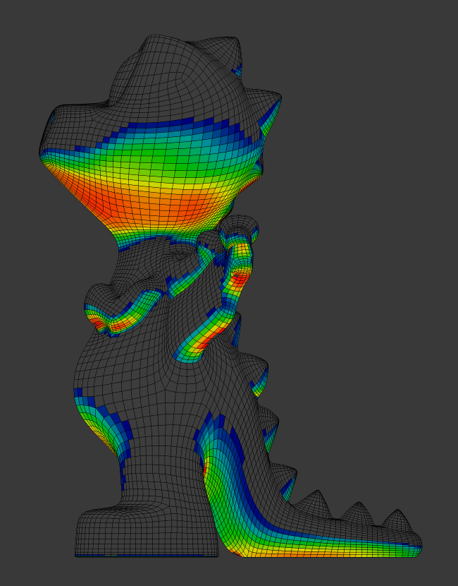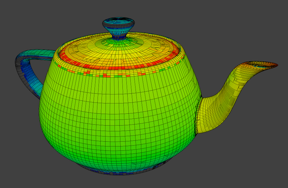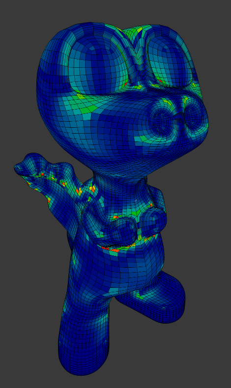 The mesh analysis works in Edit Mode and Solid Viewport shading. It shows areas with a high value in red, and areas with a low value in blue. Geometry outside the range is displayed gray.