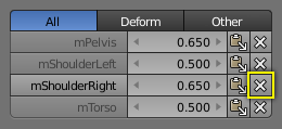 LMB the Delete button will instantly remove the weight from the active vertex. Thus the entire row disappears when you click on the delete icon.
