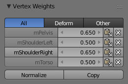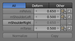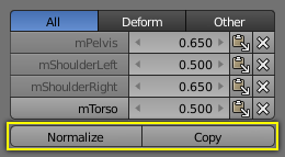 Note that both tools only work on the vertex groups currently displayed in the Weights Table. So if for example only the Deform weights are displayed, then Normalize and Copy only affect the Deform bones.