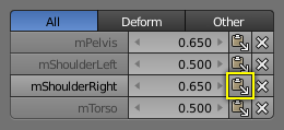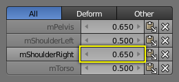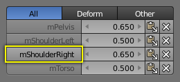 Strictly speaking, the sum of all deform weights for any vertex of a mesh should be exactly 1.0. In Blender this constraint is a bit relaxed (see below). Nevertheless, deform groups should always be seen as related to each other. Hence, we have provided a filter that allows restricting the Vertex Weight panel to display only the deform bones of an object.
