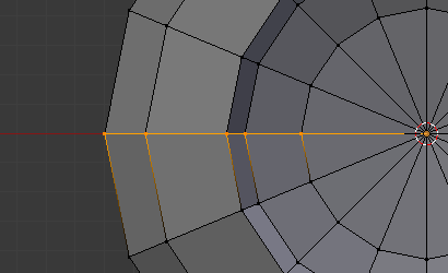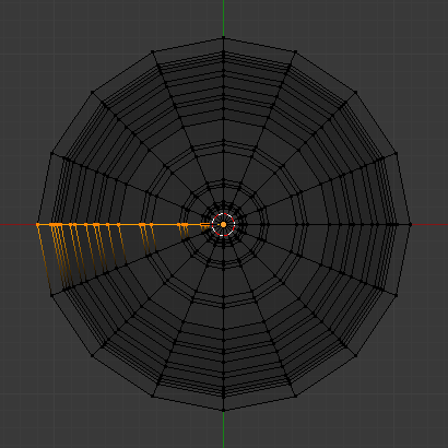 Place the cursor along the center of the profile by entering Edit Mode and selecting one of the vertices along the center, and snapping the 3D cursor to that location with . (Fig. Glass profile, top view in Edit Mode, just before spinning.) shows the wine glass profile from top view, with the cursor correctly positioned.