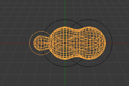 Fig. Meta ball base. shows the base meta labeled “B”. The other two Meta objects are children. Children’s selection rings are always black, while the group’s mesh is orange. Because the metas are grouped, they form a unified mesh which can always be selected by selecting the mesh of any meta in the group.