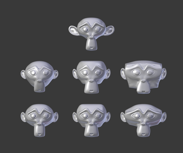 Top: Suzanne without modifiers. Middle: Suzanne with each type of Cast Modifier (Sphere, Cylinder and Cuboid). Bottom: Same as above, but now only X axis is enabled. Sample blend-file.