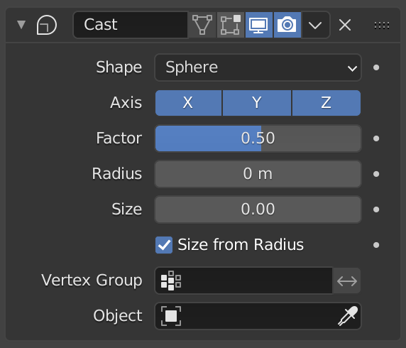 Toggle buttons to enable/disable the modifier in the X, Y, Z axes directions (X and Y only for Cylinder cast type, since the Z axis remains unaffected).