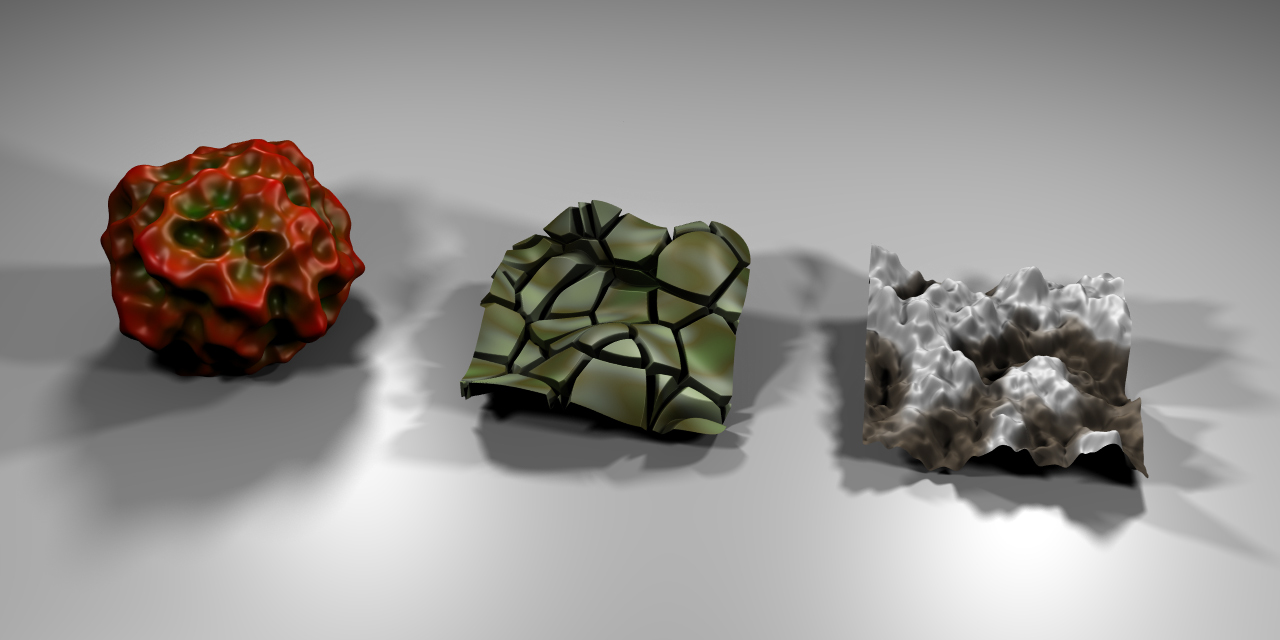 Three different objects created with the Displace modifier. Sample blend-file.