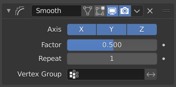 The Smooth modifier smooths a mesh by flattening the angles between adjacent faces in it, just like the Smooth tool in Edit Mode. It smooths without subdividing the mesh, the number of vertices remains the same.