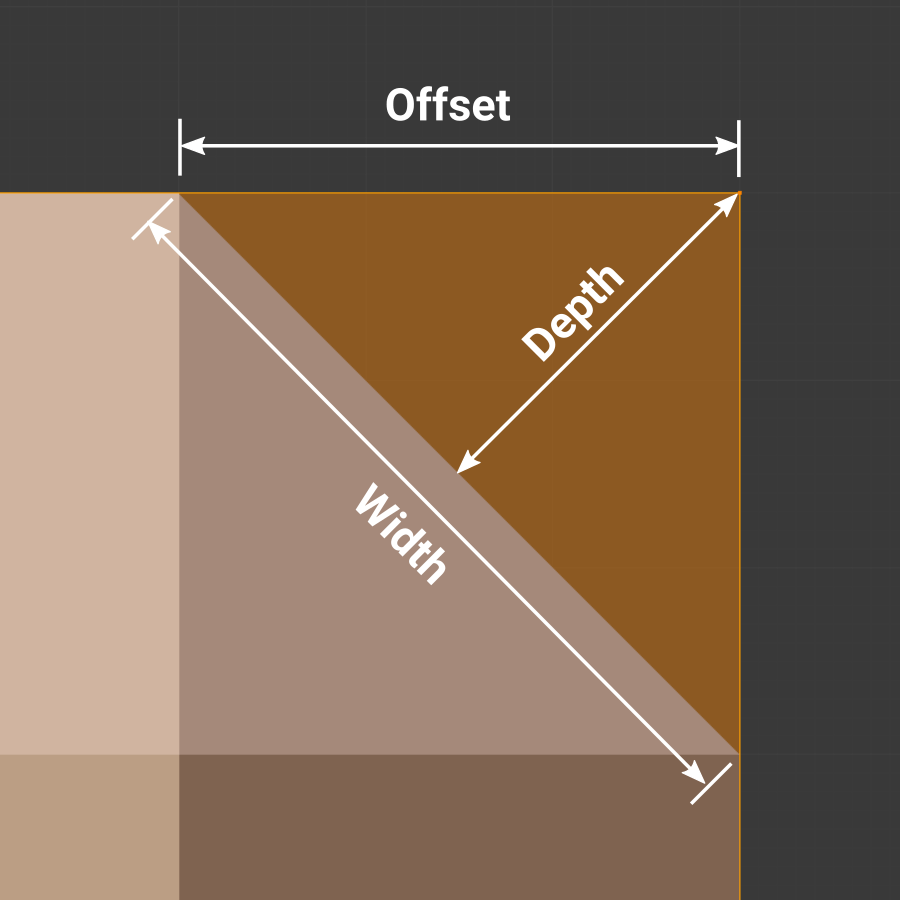 The exact distance along edges adjacent to the beveled edge. A difference from Offset is visible when the unbeveled edges attached to beveled edges meet at an angle besides a right angle.