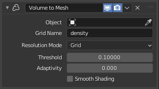 This modifier is the inverse of the Mesh to Volume modifier. It takes an existing volume object and converts one of its grids to a mesh. Only scalar grids (such as the density grid) can be converted.