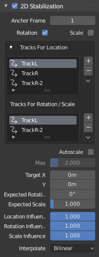 The amount of transformation applied to the footage can be controlled. In some cases it is not necessary to fully compensate camera jumps. The amount of stabilization applied to the footage can be controlled. In some cases you may not want to fully compensate some of the camera’s jumps. Please note that these “* Influence” parameters do control only the compensation movements calculated by the stabilizer, not the deliberate movements added through the “Expected *”-parameters.