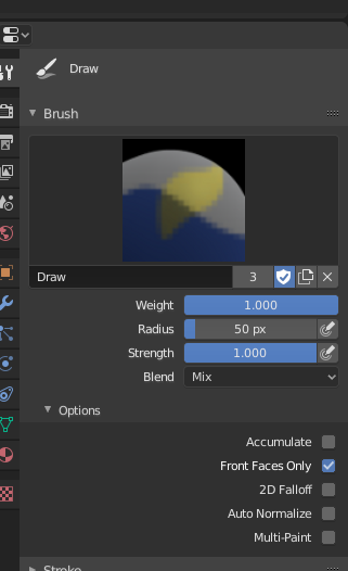 The weight (color) to be used by the brush. However, the weight value is applied to the vertex group in different ways depending on the selected Brush Blending mode (see below).